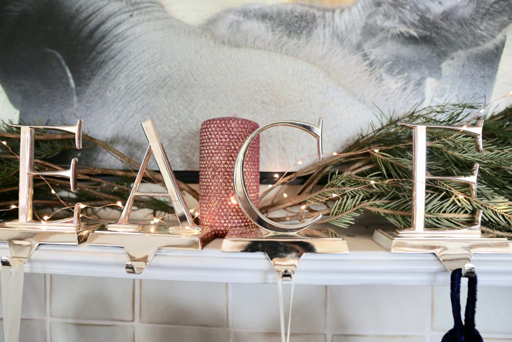 I picked up some free Christmas tree cuttings from Home Depot, made two bunches and placed them on the mantle with a candle in the middle. I added few additional candles and sparkle lights. And for some whimsy, I placed a nome on each side!