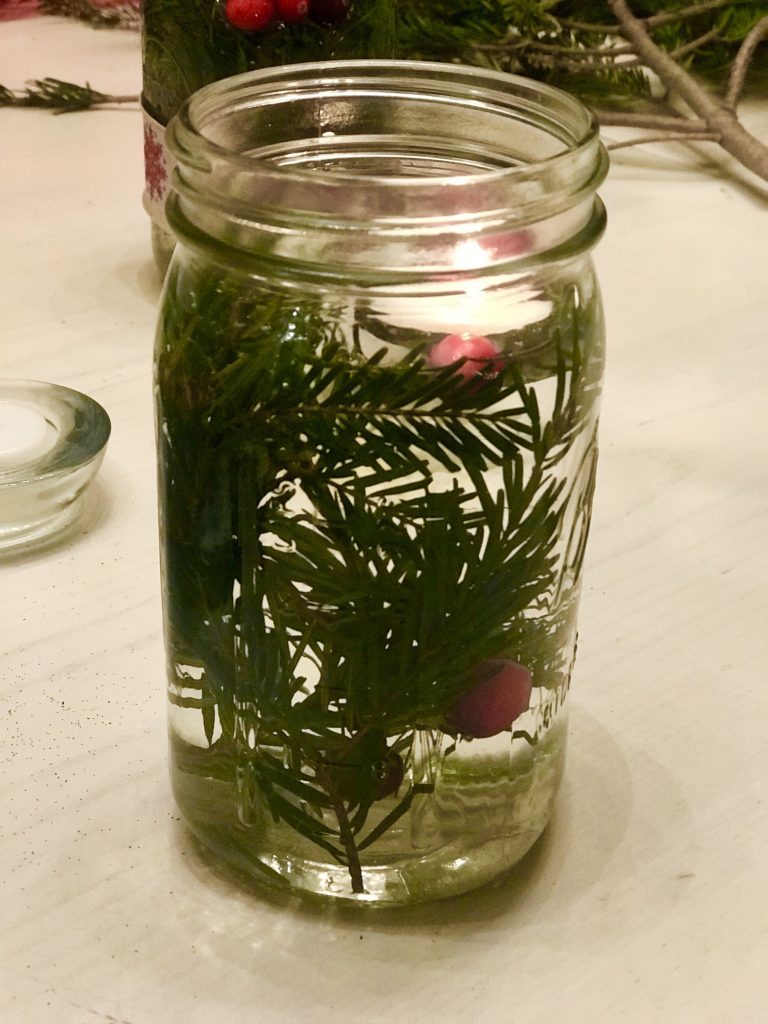 I used a few pieces from the Christmas tree, added fresh cranberries, water, and a tea light. Consider floating candles that will last a bit longer than tea lights. And Amazon has great deals on mason jars.